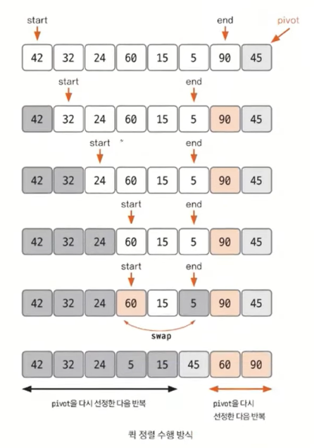 2-c. start가 가리키는 데이터가 pivot이 가리키는 데이터보다 크고, end가 가리키는 데이터가 pivot이 가리키는 데이터보다 작으면 start, end가 가리키는 데이터를 swap하고 start는 오른쪽, end는 왼쪽으로 1칸씩 이동한다.