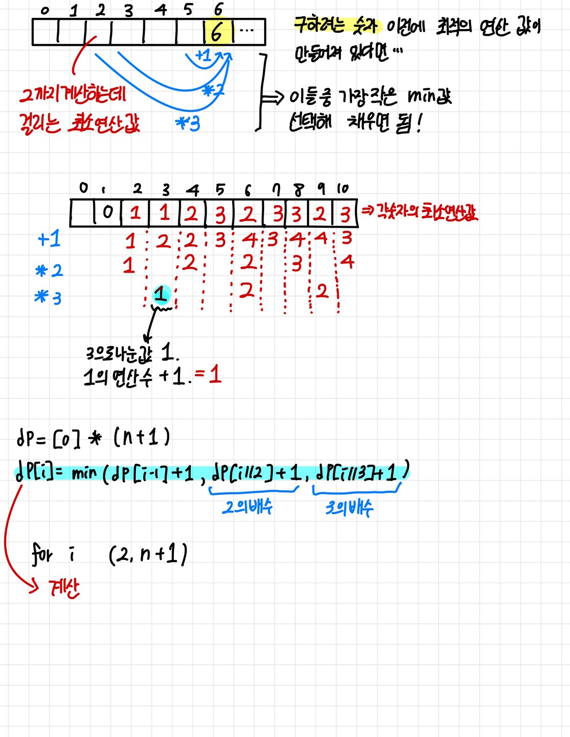 그러면 5,3,2중의 최소연산값중 가장 작은 최소연산값에 + 1을하면, 6의 최소연산값이 된다.