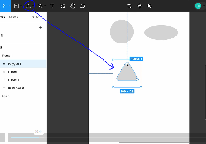 삼각형모양을 해주면 꼭지점쪽에 동그라미가 뜨는데
