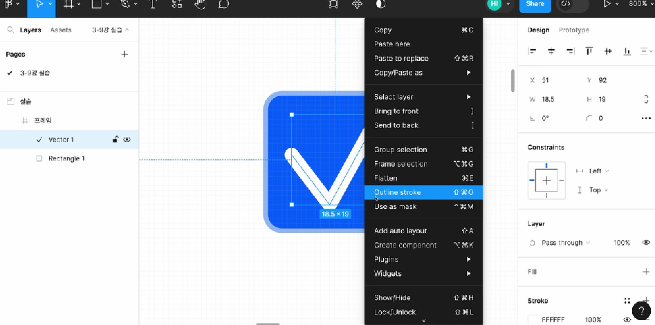 그러면 왼쪽에 Vector 1 옆에 (Stroke)가 생기면서하나의 면으로 인식이 된다.이런식으로 하나의 UI를 만들 수 있는것이다.