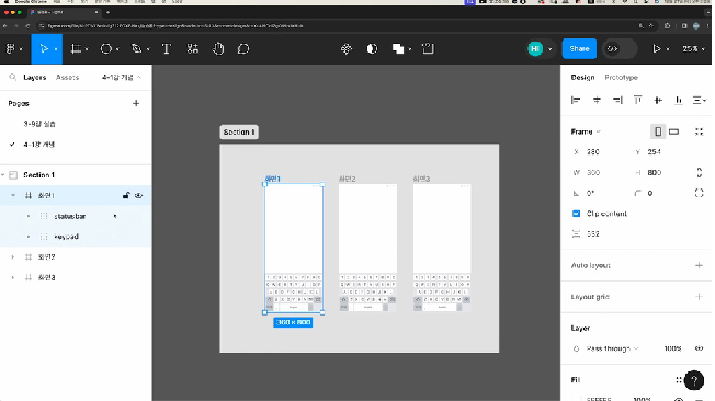 그 플로우 하나하나를 프레임이 구성하게 되는데 아트보드용도로 새로운 화면들로 구성하게 된다.