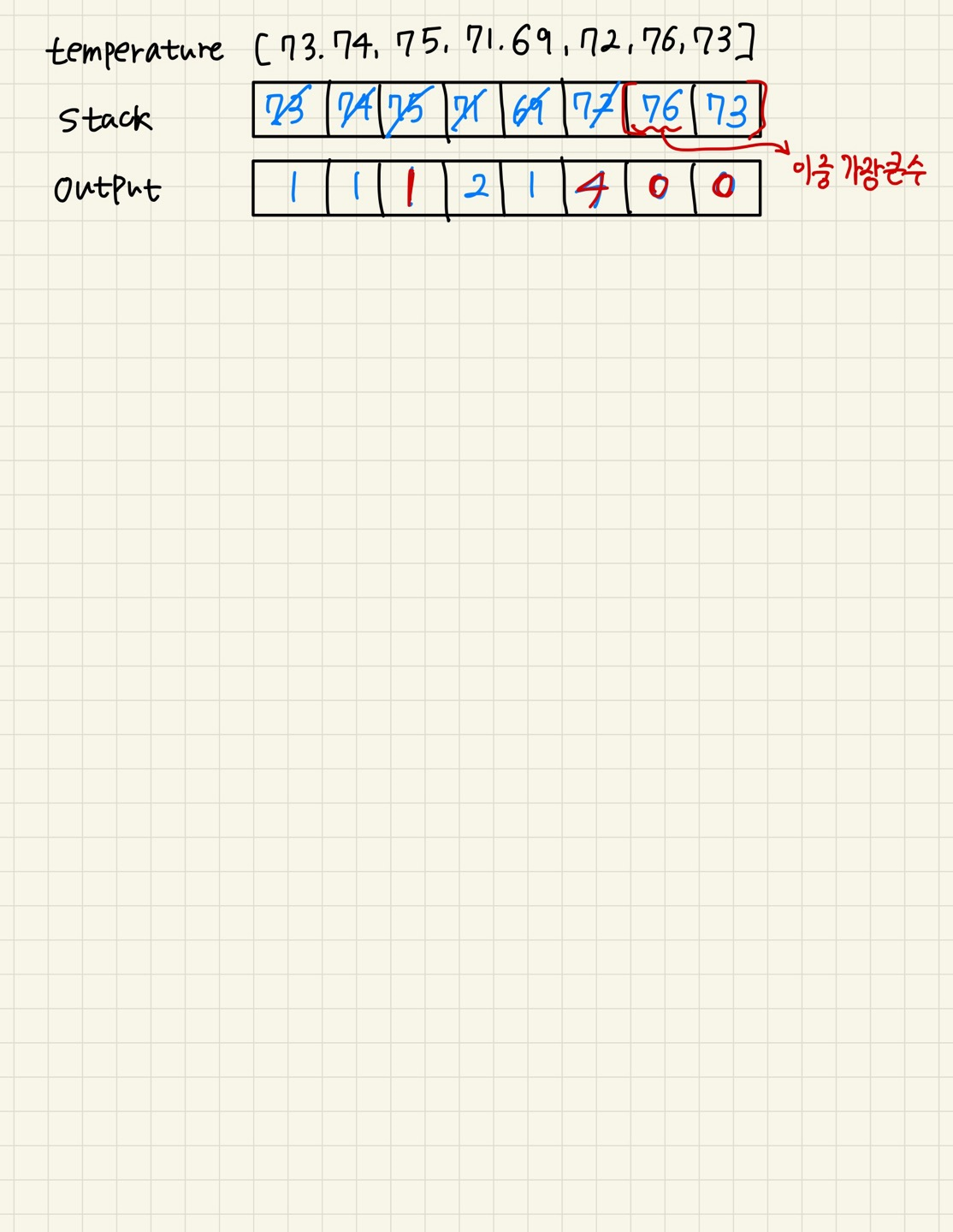 75: 74 < 75이므로 74를 pop()한다. 그리고 output 해당 인덱스 자리에 75와의 인덱스 차(1) 를 넣는다. 그 후 stack에 75를 넣는다.