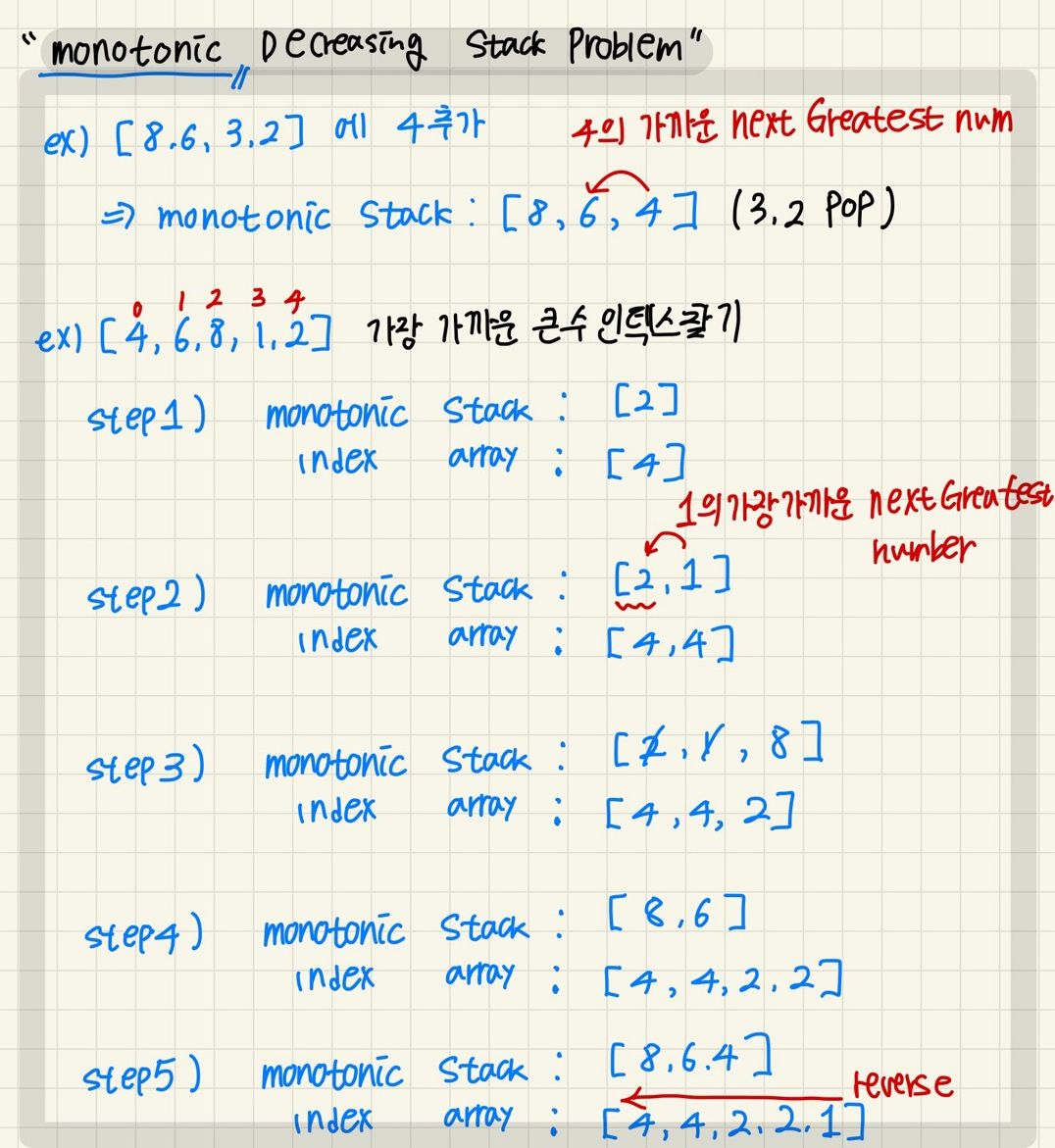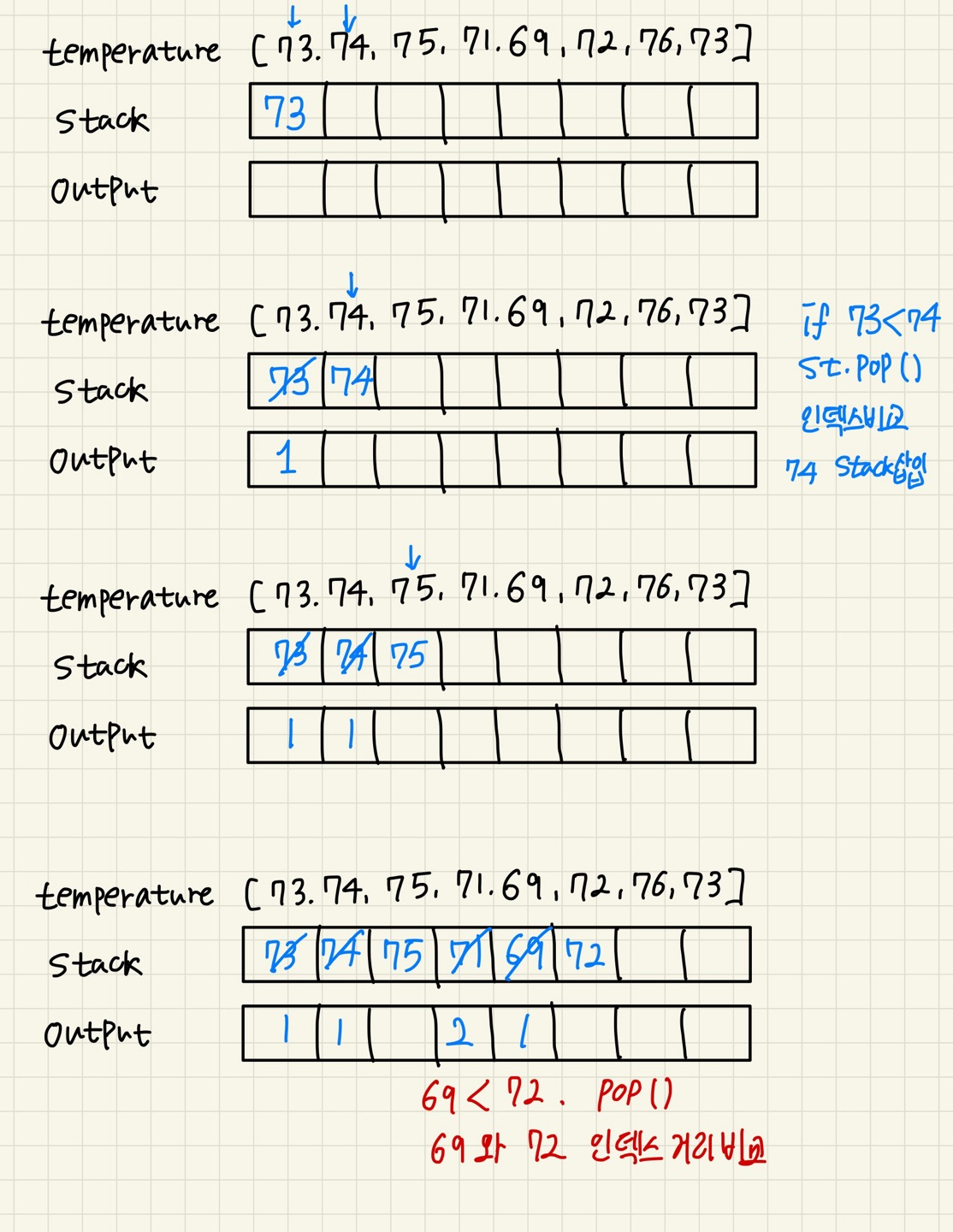 결국 이 문제의 핵심은 모노토닉 스택(monotonic stack)을 사용하여 다음으로 높은 기온이 나올 때까지의 일 수를 계산하는 것이다.