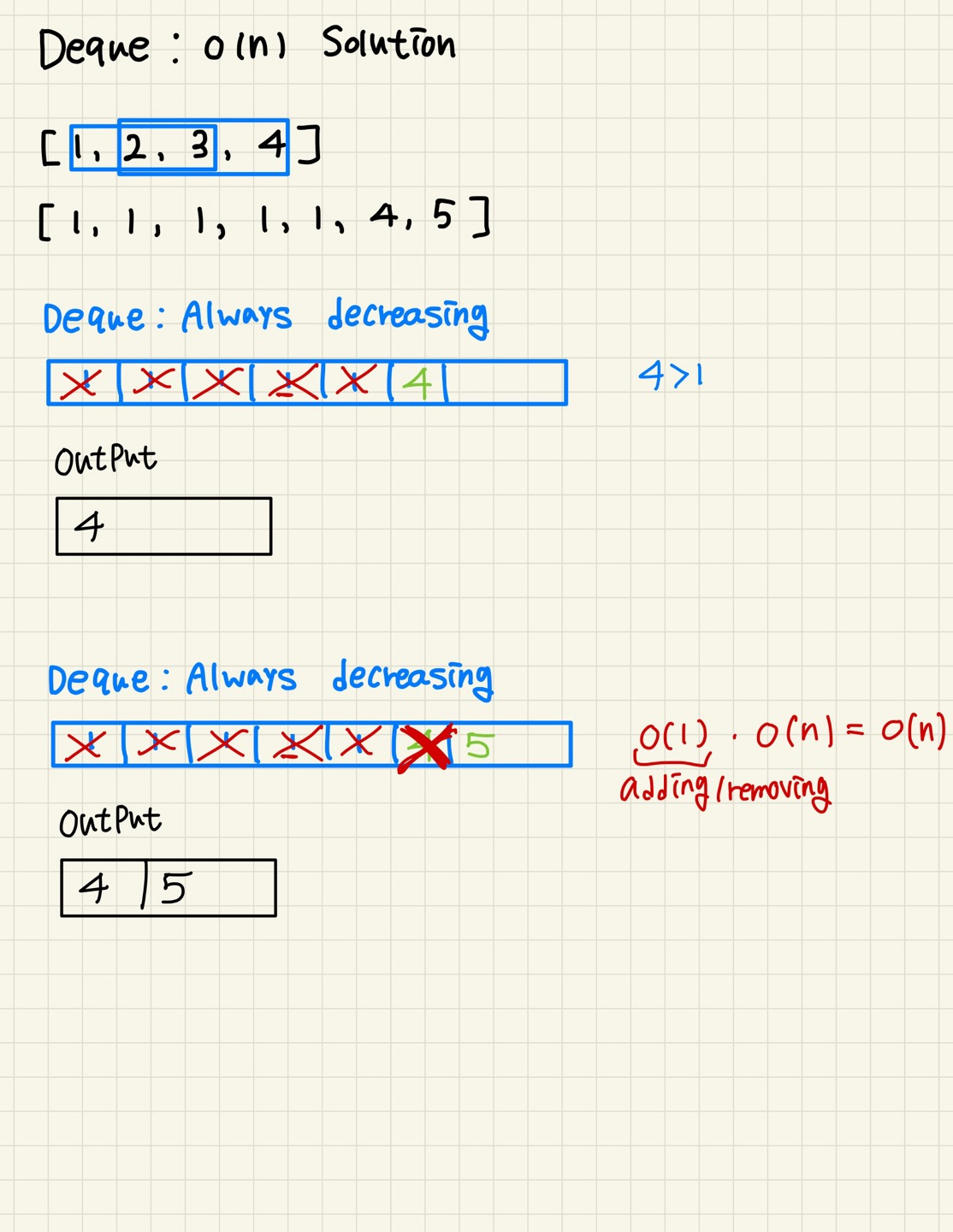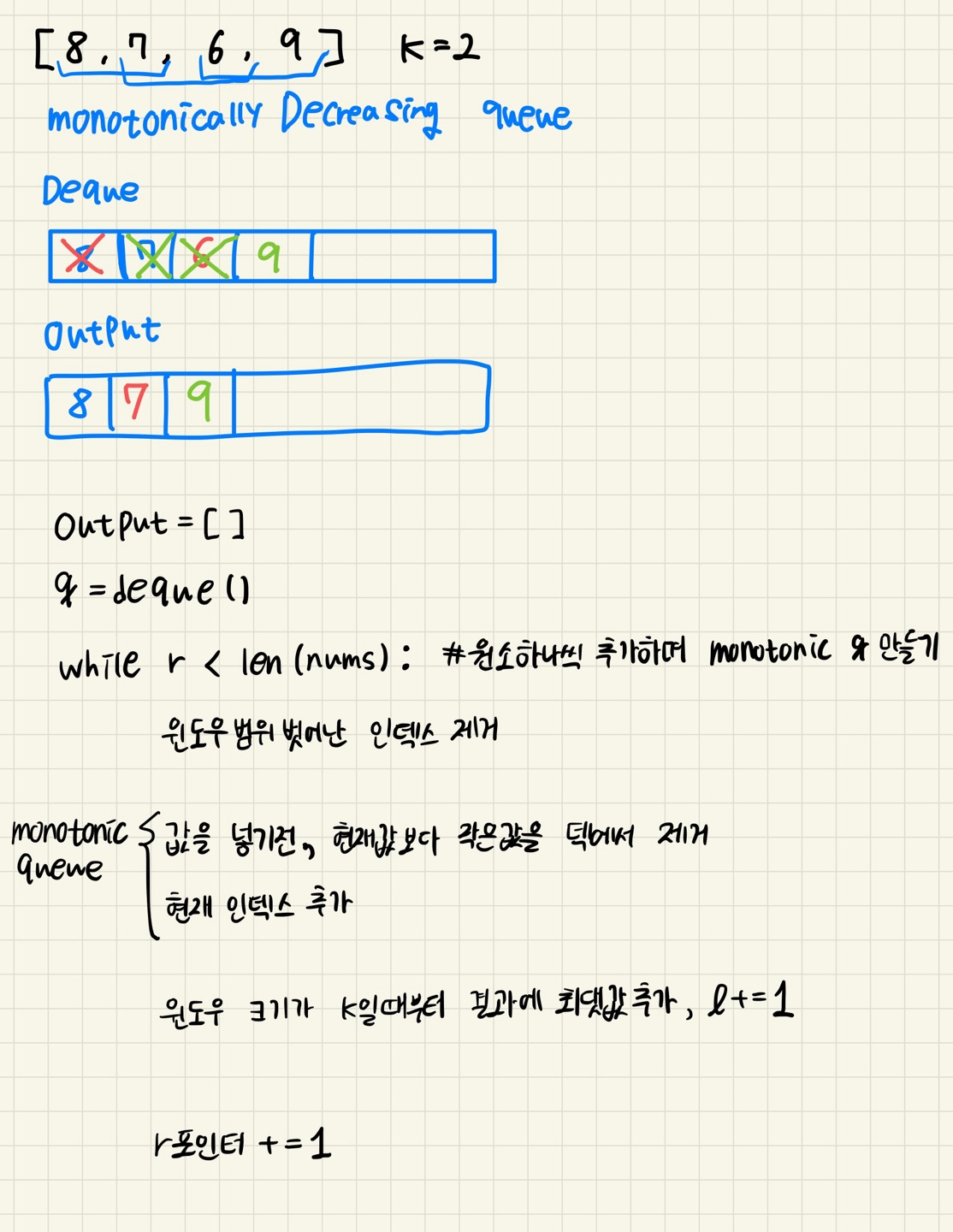 이때, 값을 넣기전 현재값이 덱 끝값보다 크다면 덱에서 제거한다. (ex_ q = [1,2,3,4] 현재값=7 ~> 4,3,2,1 순으로 pop()하고 7을 넣는다.)