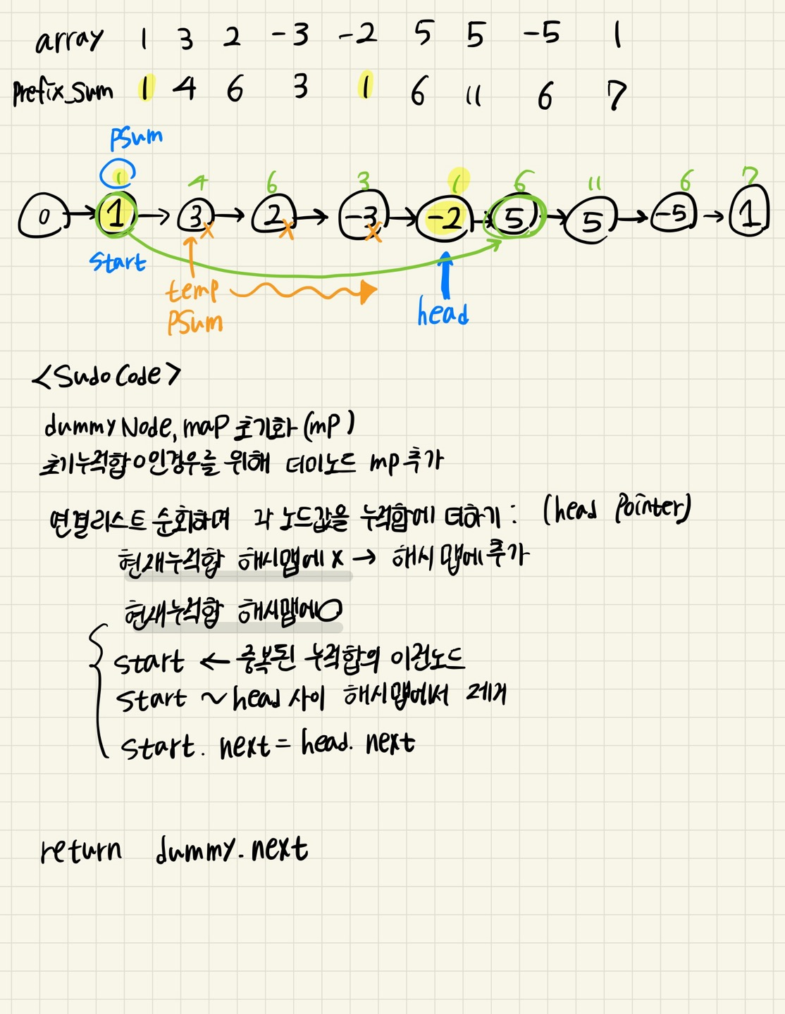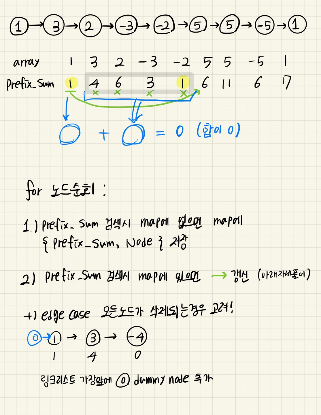 위 그림처럼 head를 이동하다가 같은 prefixSum이 나오면, start를 중복된첫번째노드로 설정하고 temp,psum을 통해 해시맵에서 중간노드들을 제거해나간다. 이 중간노드들을 제거하는 이유는 예를들어 위에서 첫번째 5탐색시, 이전에 삭제한 노드범위를 중복해서 탐지하지 않게 하기 위해서다.