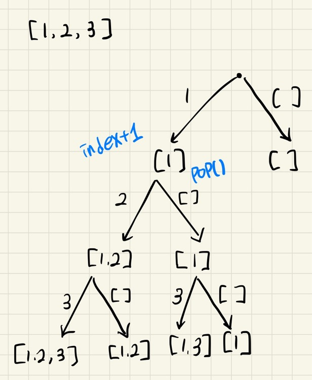 이건 풀이를 참조했는데, 각 숫자를 선택하는 경우 / 선택안하는경우로 케이스를 나누어 탐색하는 방법이다.