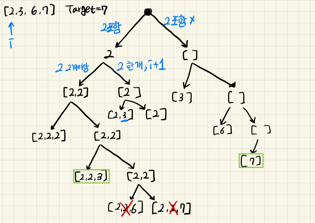 요약하면, 이 알고리즘은 후보값을 중복없이 탐색하기 위해 인덱스 포인터인 i를 사용한다. 따라서 백트래킹을 사용하여 2가 두 개 이상인 경우를 모두 탐색하고,,,i+1을 통해 2를 후보에서 제외해 주는 것이다!