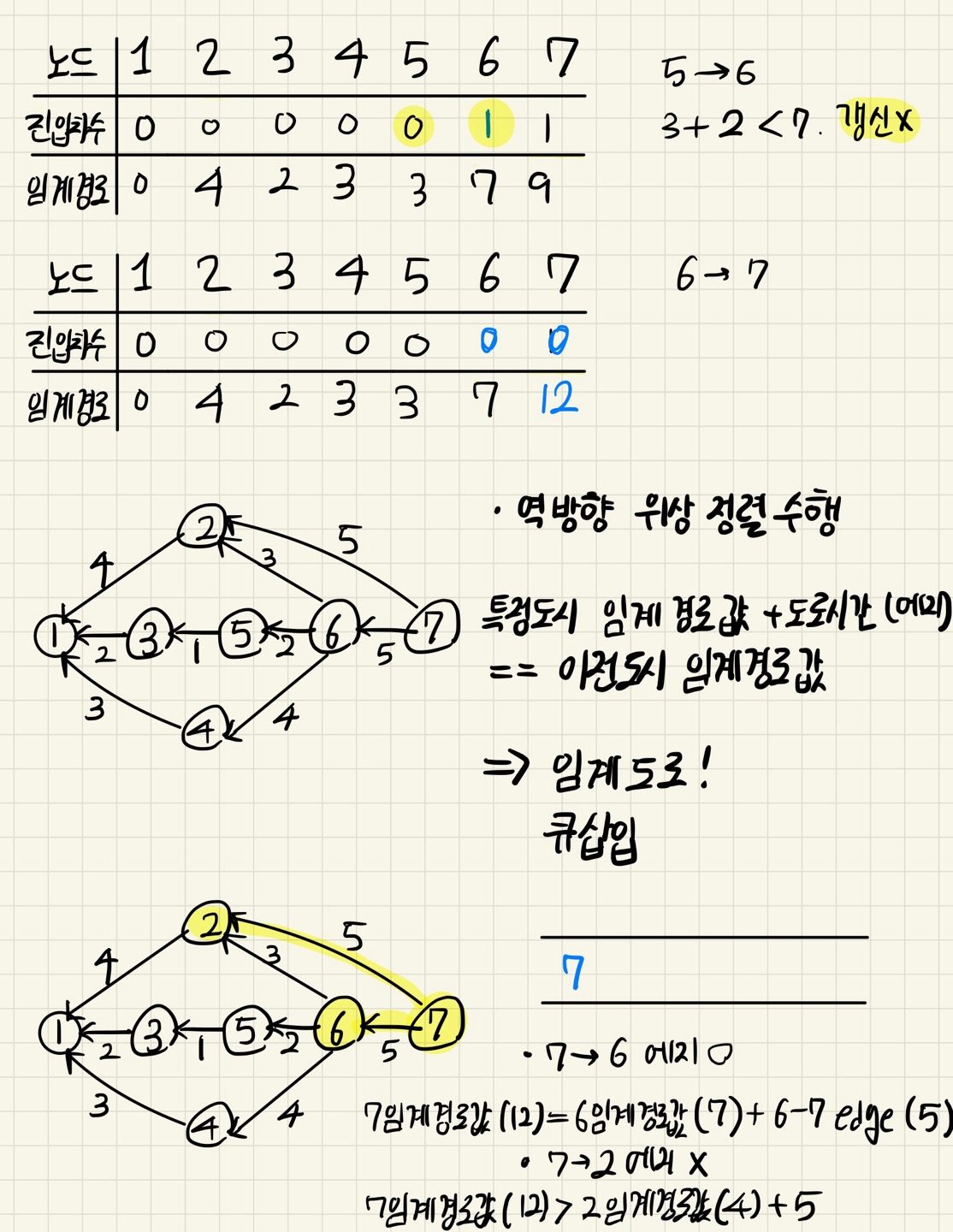 또한 역방향 위상정렬을 활용하면 도착 도시에서 출발하여 출발 도시까지 가는 임계 경로를 찾아나갈 수 있다. 그 방법은 다음과같다.