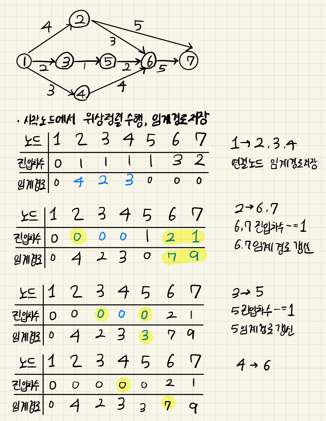 - [그림1~그림2] 시작 노드에서부터 위상 정렬을 수행해나가며, 각 도시와 관련된 임계 경로를 누적하며 저장한다. 즉, 위상 정렬된 순서대로 방문하면서 각 도시 시간 최댓값을 취하여 기록한다.