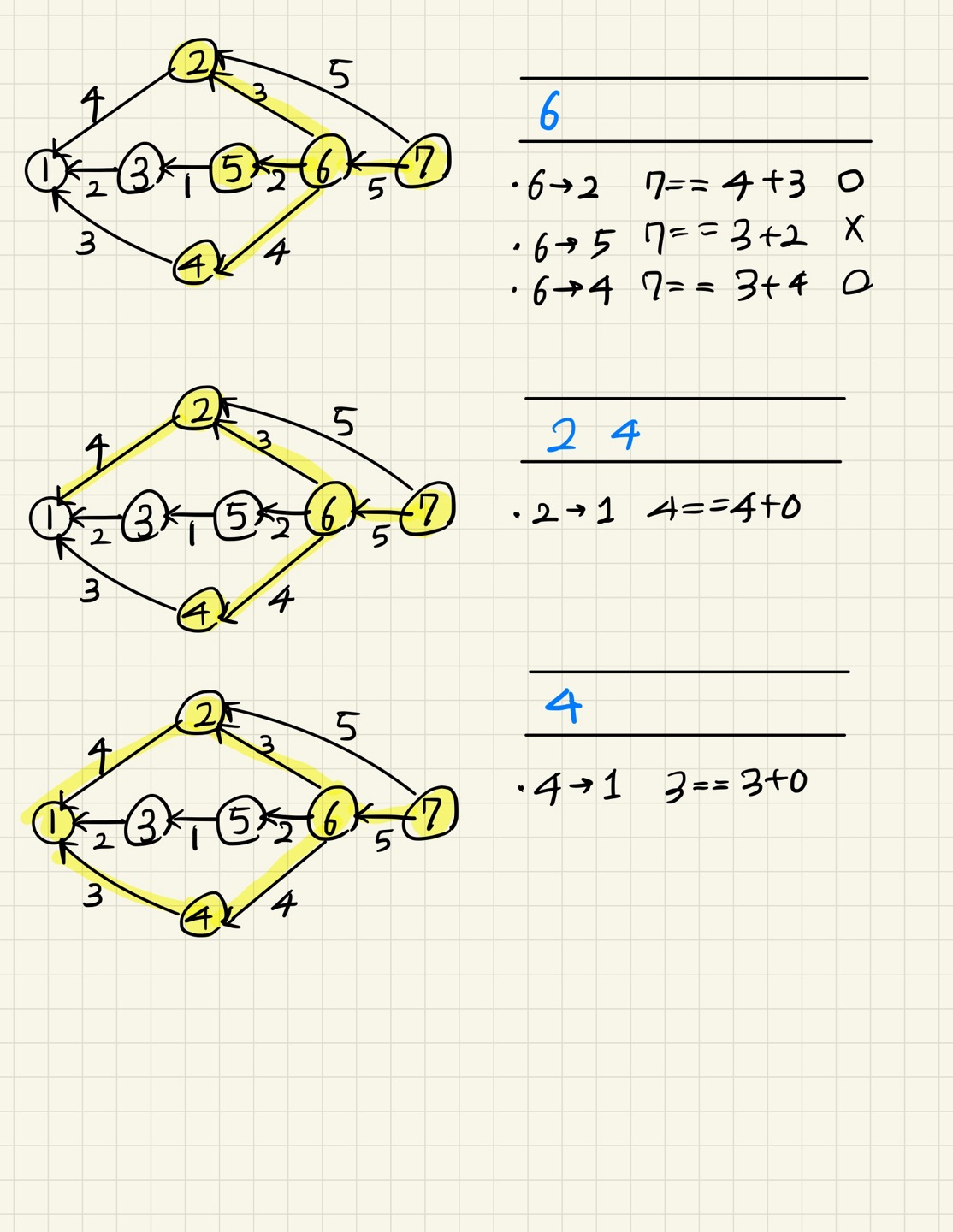 이제 6을 보자. 6에서 연결노드는 2, 5, 4이고 6의 최장 시간은 7이다. 7에서 했던것처럼, 위 과정을 출발 노드에 도달할때까지 반복한다.