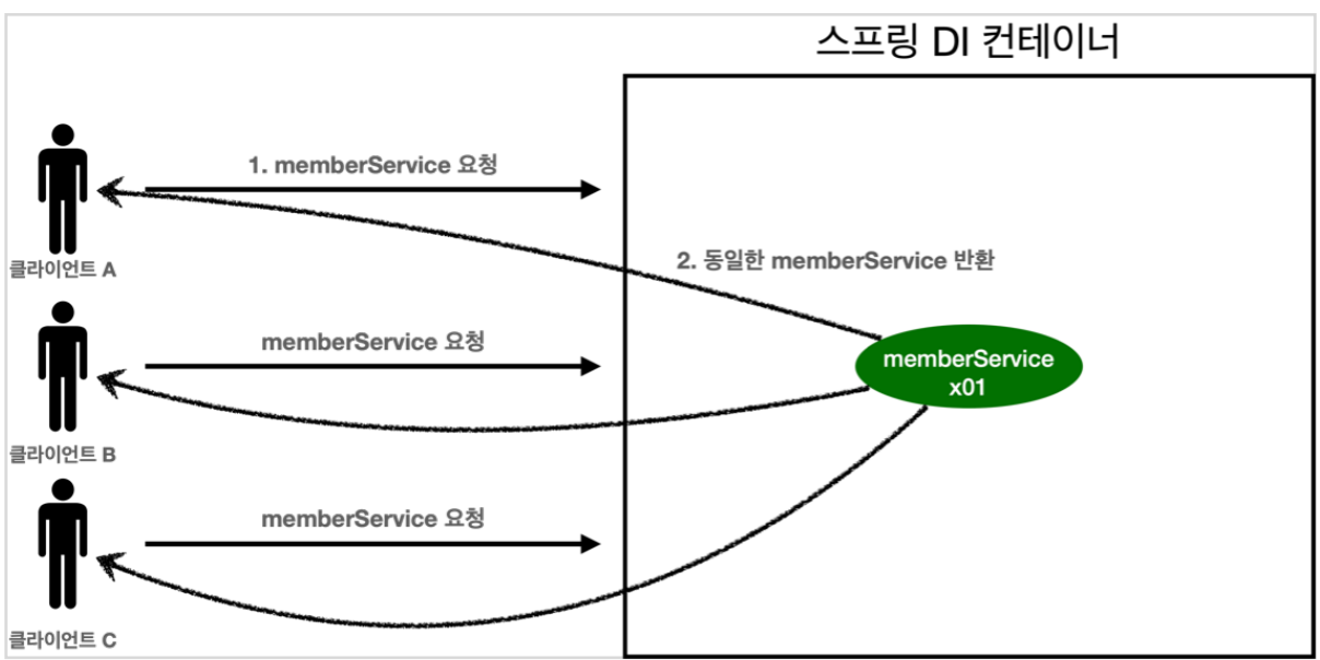 🪄 참고: 스프링의 기본 빈 등록 방식은 싱글톤이지만, 싱글톤 방식만 지원하는 것은 아니다. 요청할 때 마다 새로운 객체를 생성해서 반환하는 기능도 제공한다. 자세한 내용은 뒤에 빈 스코프에서 설명한다.