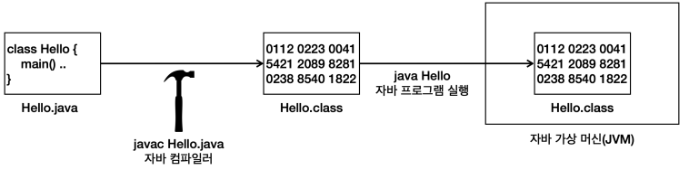 - 자바는 OS 호환성 문제를 해결한다. Hello.class 와 같이 컴파일된 자바 파일은 모든 자바 환경에서 실행할 수 있다.