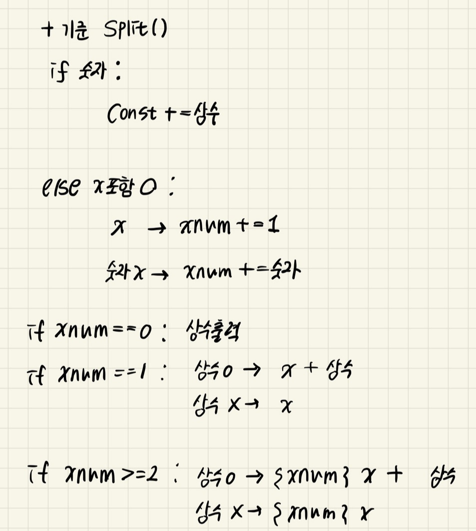 각 항을 돌며 const,xnum에 경우수를 축적해준다. 그리고 xnum과 상수여부에 따라 값을 구분해 출력해준다.