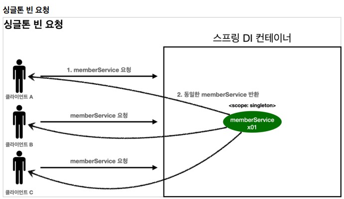 - 싱글톤: 기본 스코프, 스프링 컨테이너 시작 ~ 종료까지 유지 (가장 넓은 범위)