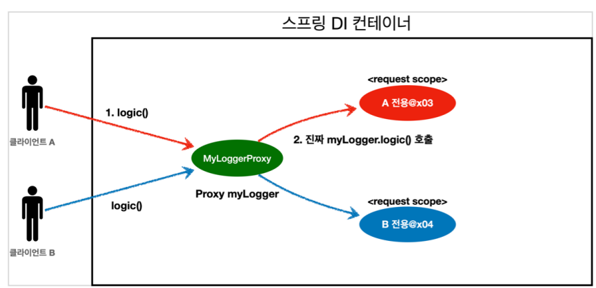 - 클라이언트가 myLogger.logic() 을 호출하면 사실은 가짜 프록시 객체의 메서드를 호출한 것이다. 가짜 프록시 객체는 request 스코프의 진짜 myLogger.logic() 를 호출한다.