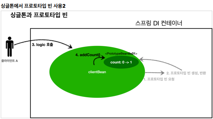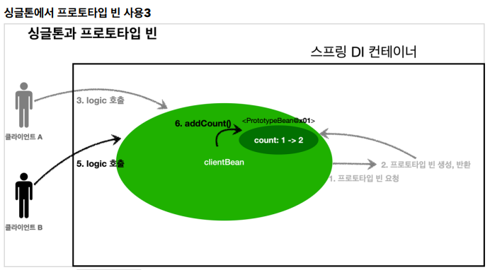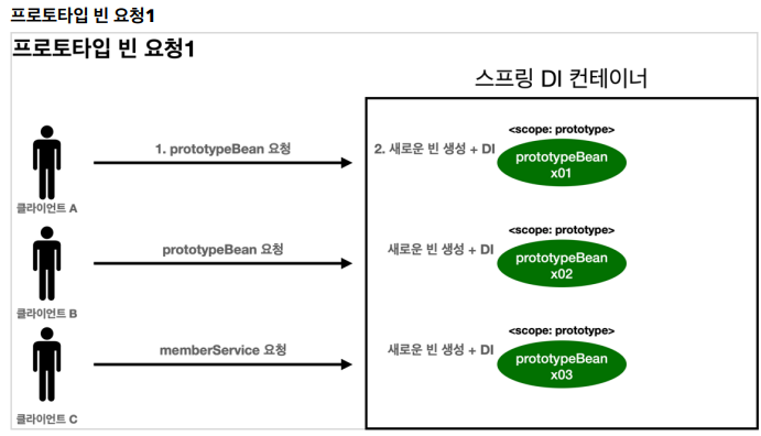 🪄 여러 빈에서 같은 프로토타입 빈을 주입 받으면, 주입 받는 시점에 각각 새로운 프로토타입 빈이 생성된다. 예를 들어서 clientA, clientB가 각각 의존관계 주입을 받으면 각각 다른 인스턴스의 프로토타입 빈을 주입 받는다.