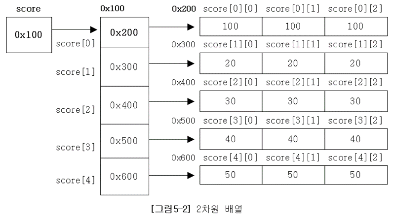 2차원 배열은 배열의 배열이다. 위에서 score.length는 score가 참조하고 있는 배열의 길이 5이다.