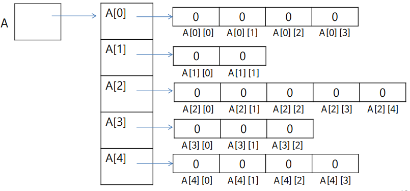 2차원 배열은 배열의 배열이므로, 아래와 같이 행마다 다른 길이의 배열을 생성하는 것이 가능하다.