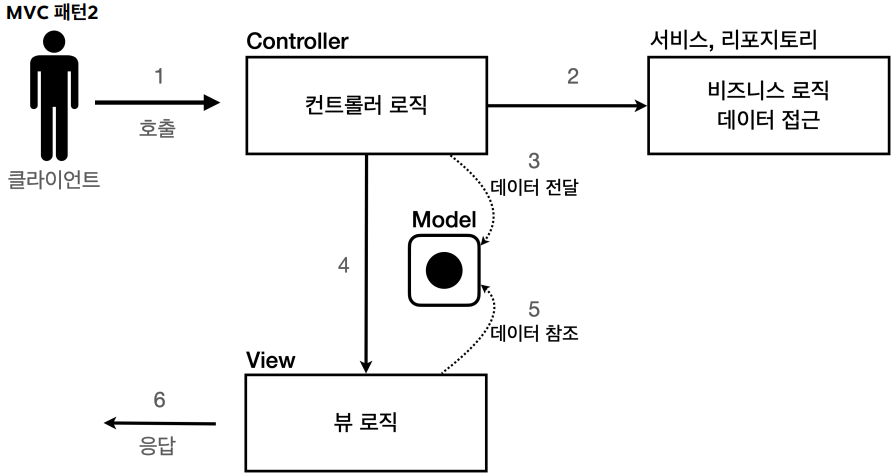 - 모델: 뷰에 출력할 데이터를 담아둔다. 뷰가 필요한 데이터를 모두 모델에 담아서 전달해주는 덕분에 뷰는 비즈니스 로