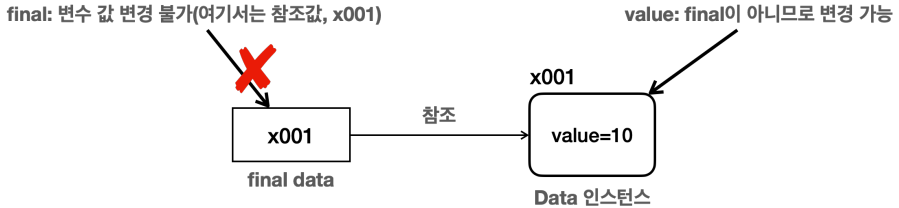 위를 보면, data 에 final이 붙어 참조값 변경이 되지않지만(다른 객체 참조 불가), Data.value는 final이 아니므로 값 변경이 가능하다.
