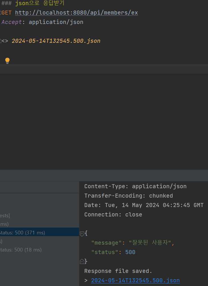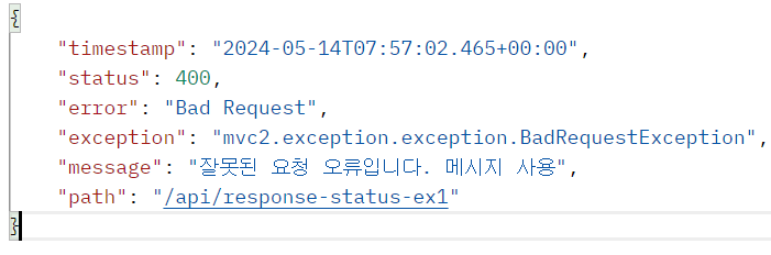 - illegalExHandle() 를 실행한다. @RestController 이므로 illegalExHandle() 에도 @ResponseBody 가 적용된다. 따라서 HTTP 컨버터가 사용되고, 응답이 JSON으로 반환된다.