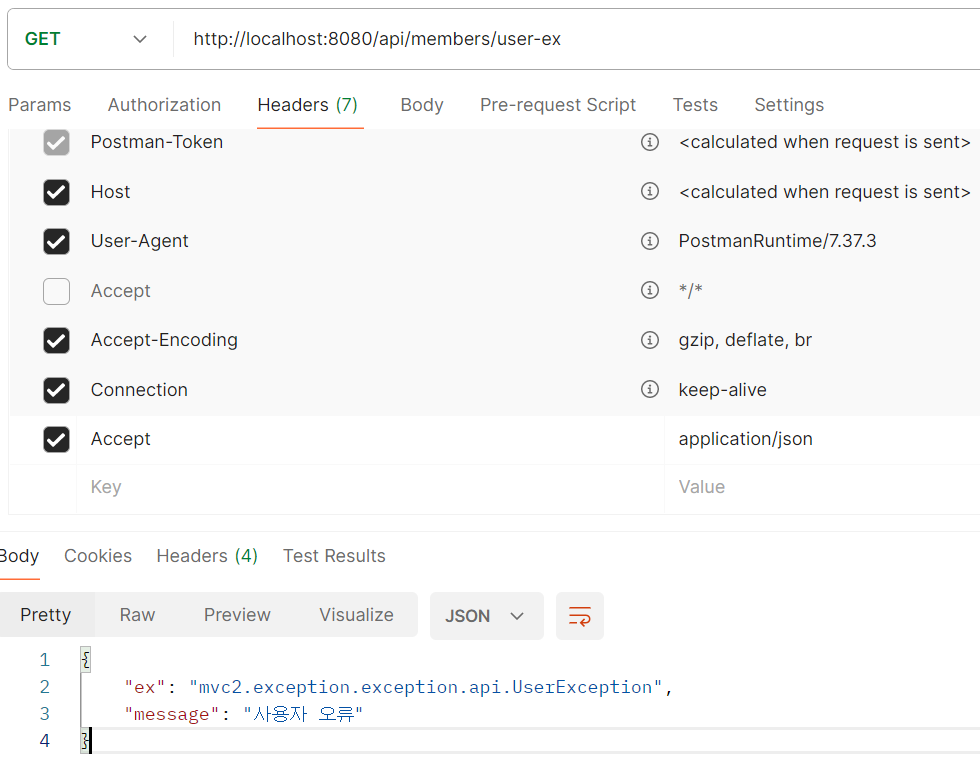 ex가 아닌경우 정상적으로 MemberDto를 반환하지만 오류가 발생하면 오류페이지 HTML이 반환된다.
