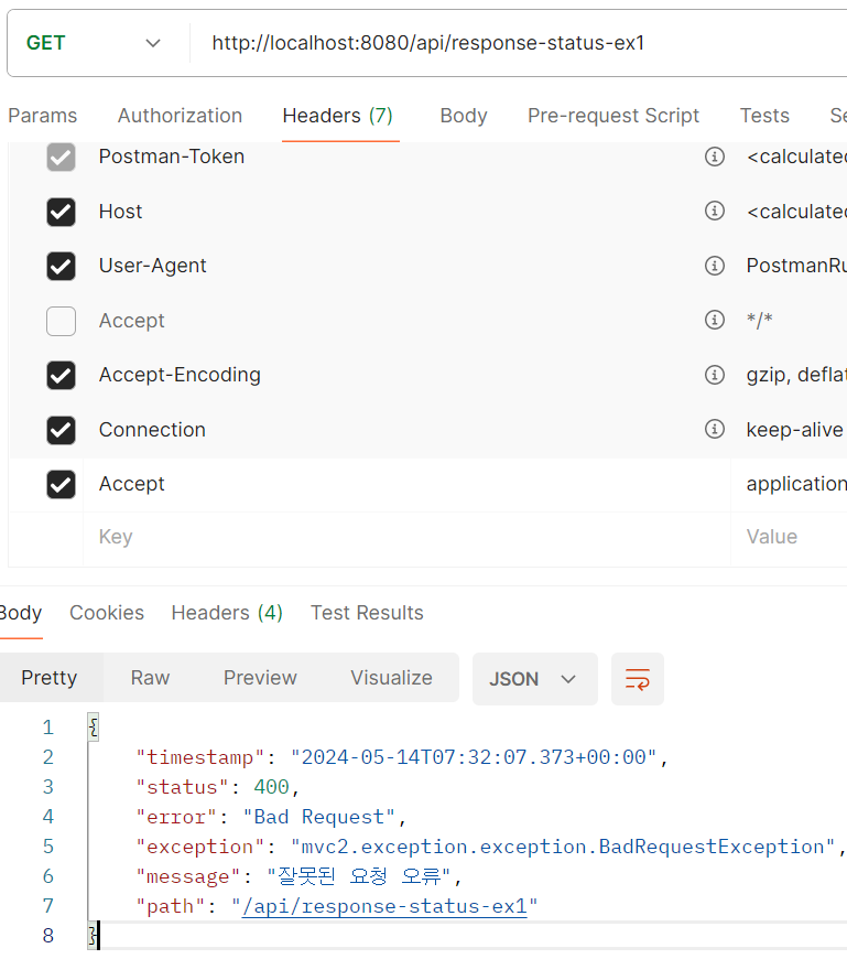 발생하는 예외에 따라 다른 상태코드를 처리해보자. 예를들어 IllegalArgumentException 을 처리하지 못해서 컨트롤러 밖으로 넘어가는 일이 발생하면 HTTP 상태코드를 400으로 처리해보자.