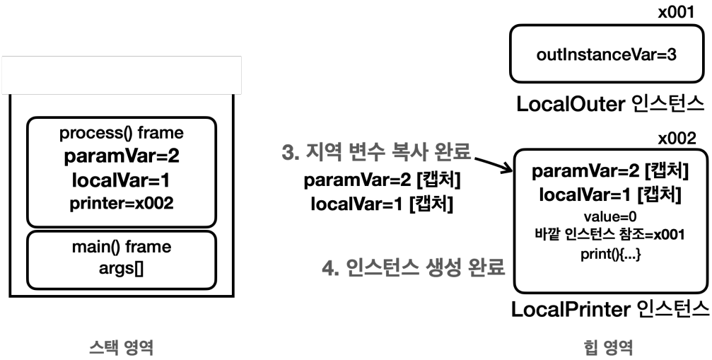 LocalPrinter 인스턴스에서 print() 메서드를 통해 paramVar , localVar 에 접근하면 사실은 스택 영역에 있는 지역 변수에 접근하는 것이 아니다. 대신에 인스턴스에 있는 캡처한 변수에 접근하는것이다.