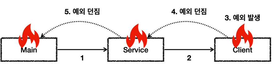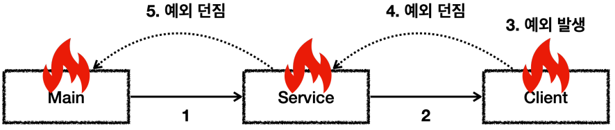 * 예외를 잡지 않아도 된다. 자연스럽게 상위로 넘어간다.