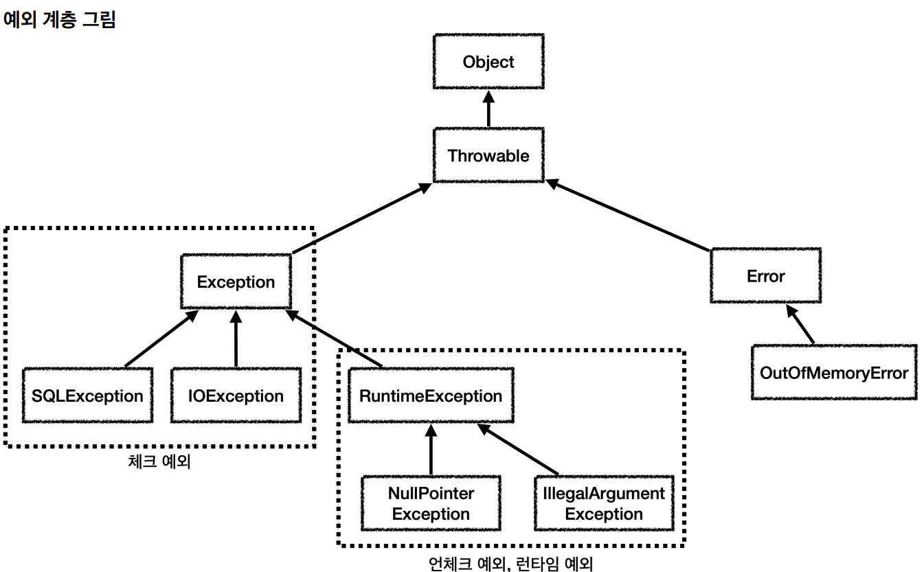 - Object : 자바에서 기본형을 제외한 모든 것은 객체다. 예외도 객체이다. 모든 객체의 최상위 부모는 Object 이므로 예외의 최상위 부모도 Object 이다.