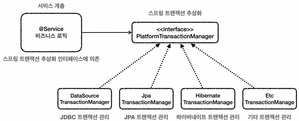 - PlatformTransactionManager라는 인터페이스를 통해 트랜잭션을 추상화