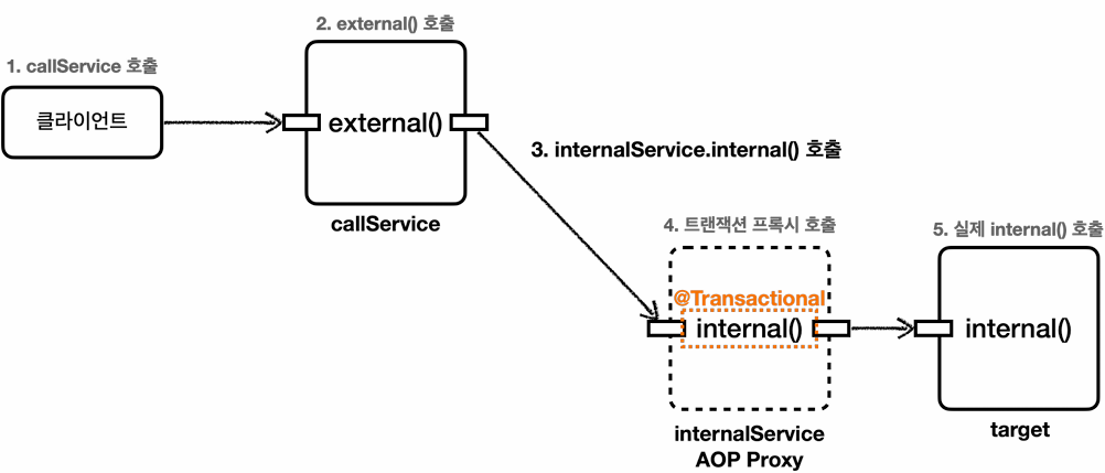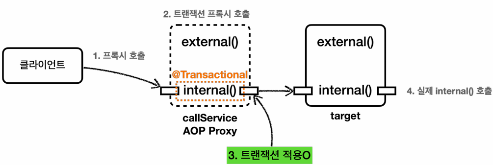 즉, @Transactional이 적용된 메서드가 클래스 내에서 직접 호출될 때 트랜잭션이 적용되지 않는다.