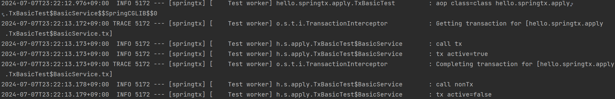 log.info("aop class={}", basicService.getClass());// 트랜잭션 적용되었기때문에 프록시 클래스