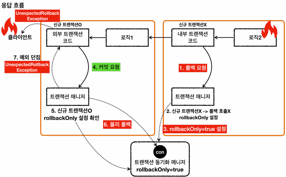 내부 트랜잭션 롤백시,실제 물리 트랜잭션은 롤백하지 않고 대신 기존 트랜잭션에 '롤백 전용'을 표시한다.