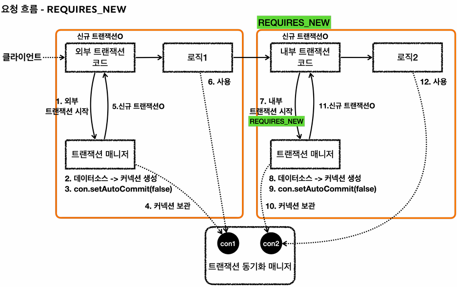 즉, 트랜잭션이 각각 수행되므로 사용되는 DB 커넥션도 각각 다르다.