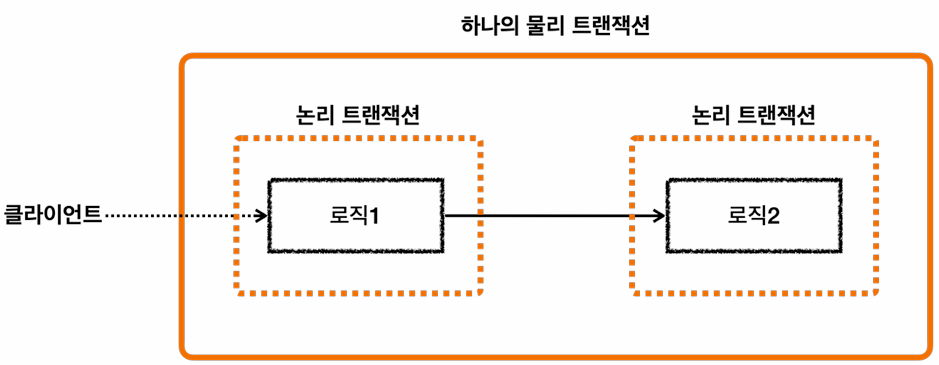 - 논리 트랜잭션: 트랜잭션 매니저를 통해 트랜잭션을 사용하는 단위