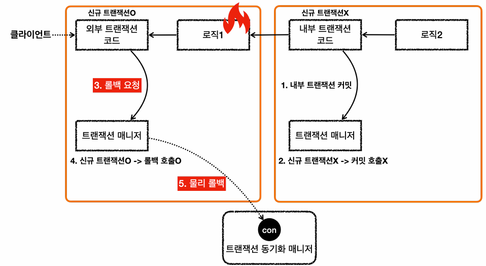 내부 커밋은 실제 커밋을 호출하지않는다. 그 후, 외부 트랜잭션이 물리 트랜잭션 시작 후 롤백한다. 외부 트랜잭션은 신규 트랜잭션이므로 DB 커넥션에 실제 롤백을 호출한다.