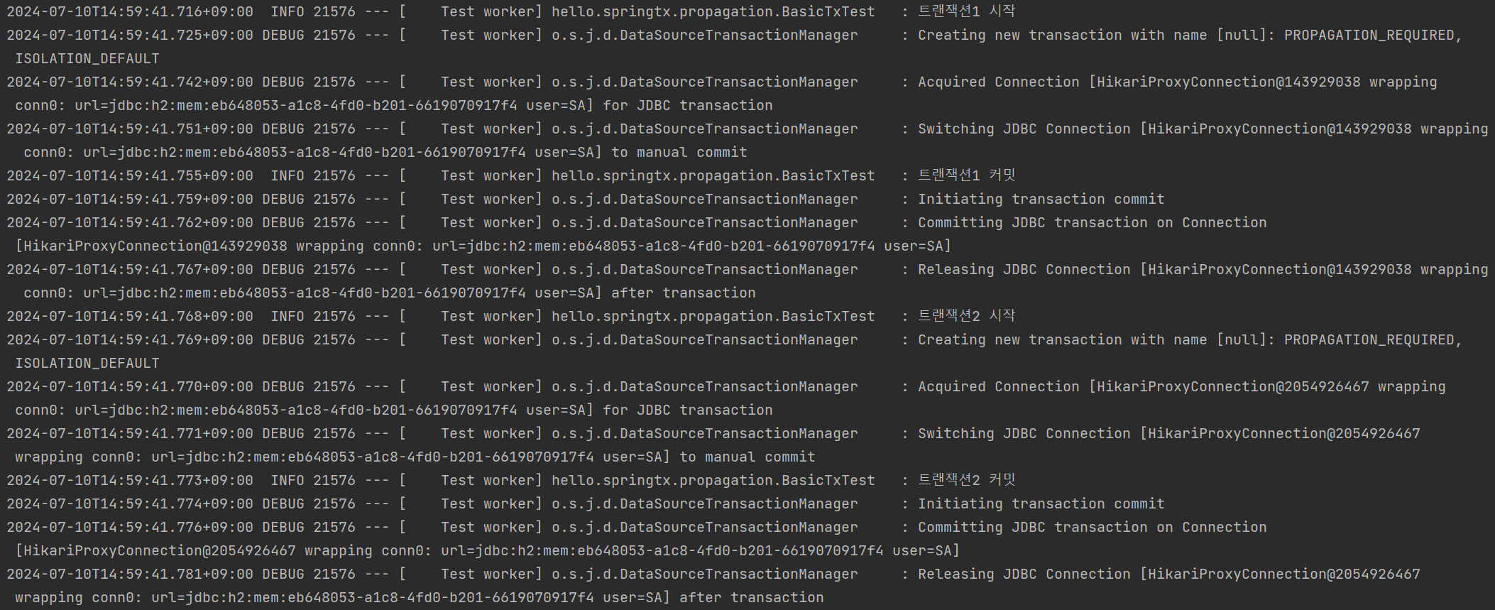 트랜잭션1이 conn0커넥션 사용후 커넥션 풀에 반납 후 트랜잭션 2가 conn0 커넥션을 커넥션 풀에서 획득한 것이다. (커넥션 재사용)