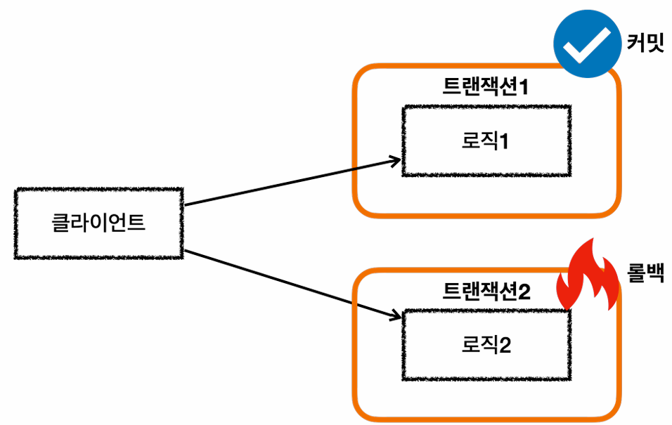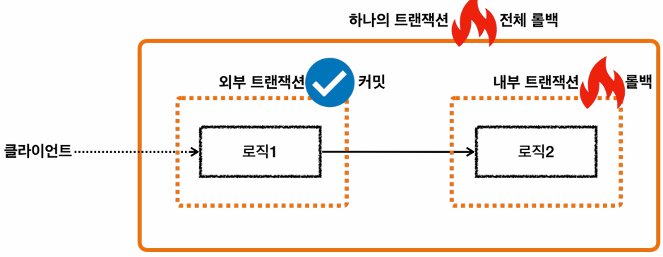 - 중첩 트랜잭션은 외부 트랜잭션의 영향을 받지만, 중첩 트랜잭션은 외부에 영향을 주지 않는다.