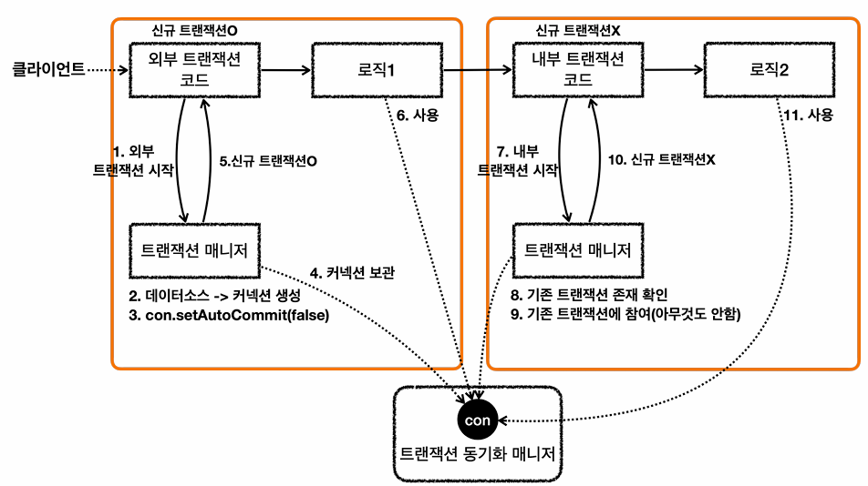 물리 커넥션을 사용하지 않는다. - 트랜잭션이 내부에서 추가로 사용되면, 트랜잭션 매니저를 통해 논리 트랜잭션을 관리하고, 모든 논리 트랜잭션이