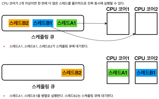 - 여러 CPU(여러 CPU 코어)를 사용하여 동시에 여러 작업을 수행하는 것을 의미