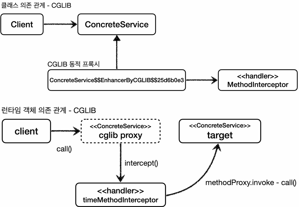 - CGLIB를 사용하면 인터페이스가 없어도 구체 클래스만 가지고 동적 프록시를 만들어낼 수 있다.