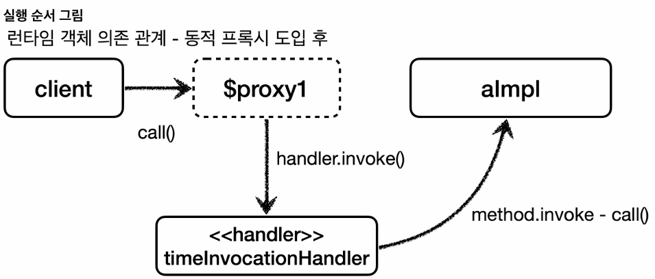 동적 프록시 call()을 실행하면 핸들러의 invoke()를 호출하고, 내부 로직실행 후 method.invoke()로 실제 객체를 호출한다.