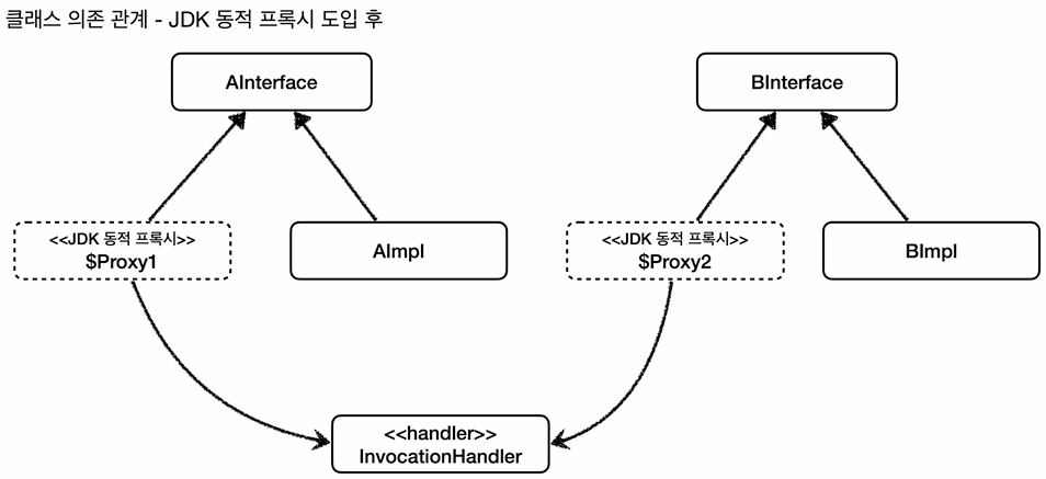 - JDK 동적 프록시는 인터페이스를 기반으로 프록시를 동적으로 만들기때문에, 인터페이스가 필수이다.