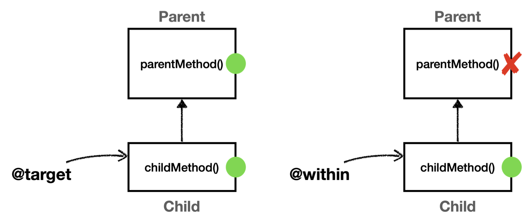 // 포인트컷 표현식에서 부모 타입을 지정한 경우, 해당 부모 타입에 선언된 메서드만 포인트컷에 매칭될 수 있다.