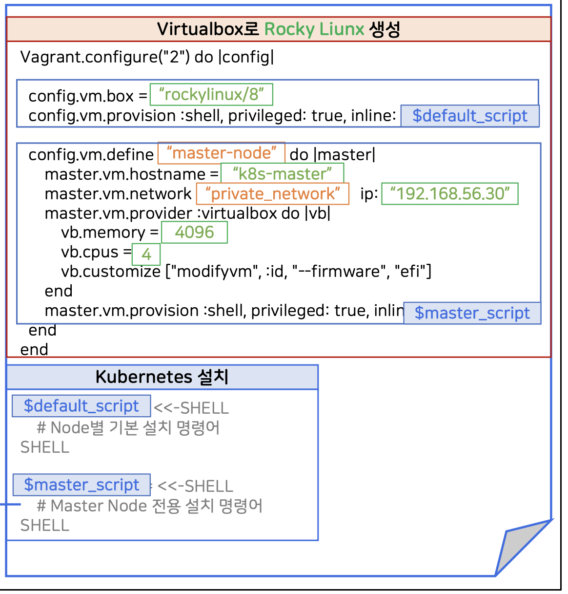 - 마스터 노드에서는 $master_script라는 특별한 스크립트를 실행해, 마스터 노드 전용 Kubernetes 설정을 자동으로 설치