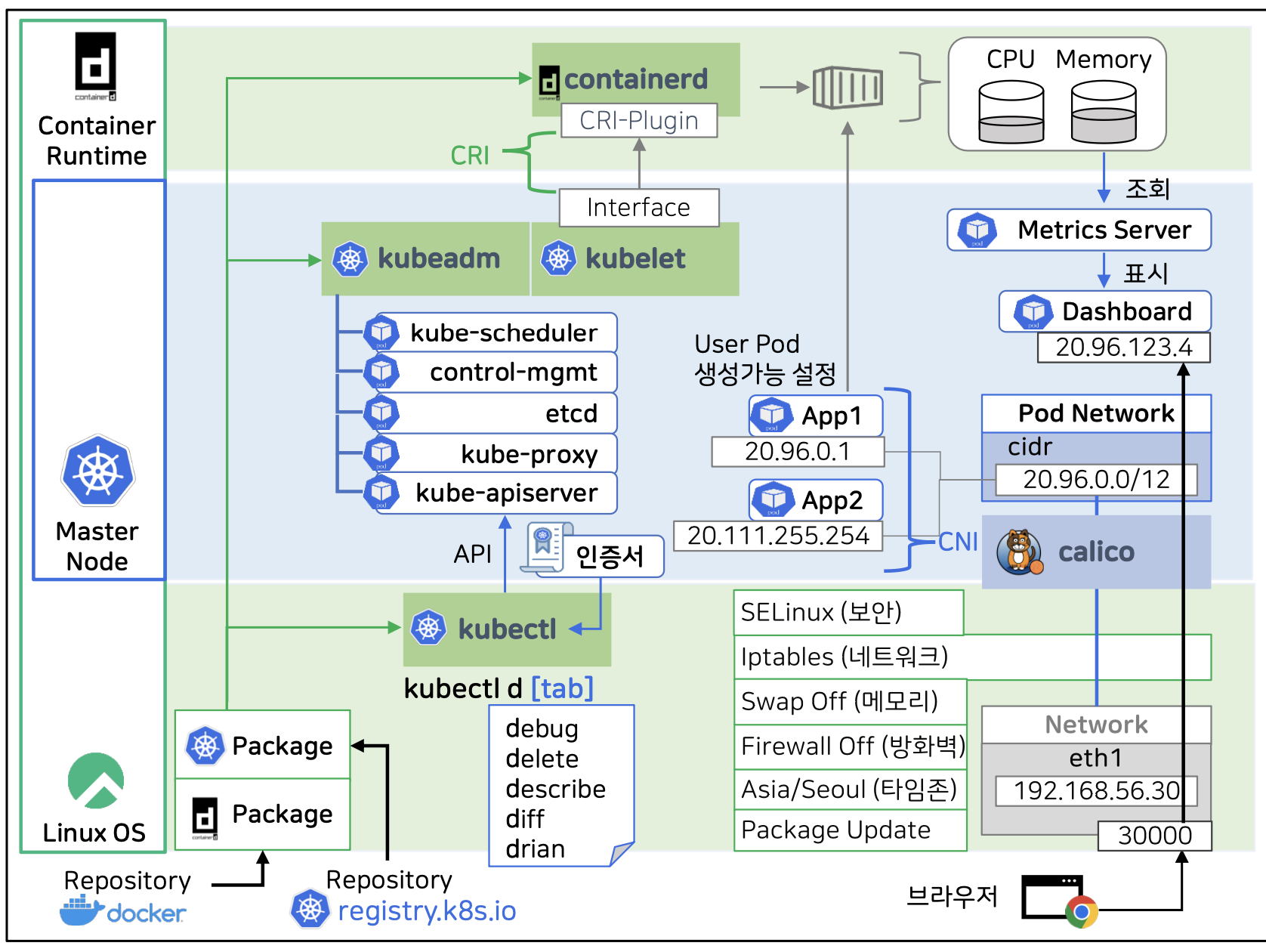 - Kubernetes 클러스터에서 제어 역할을 하는 마스터 노드를 설정.