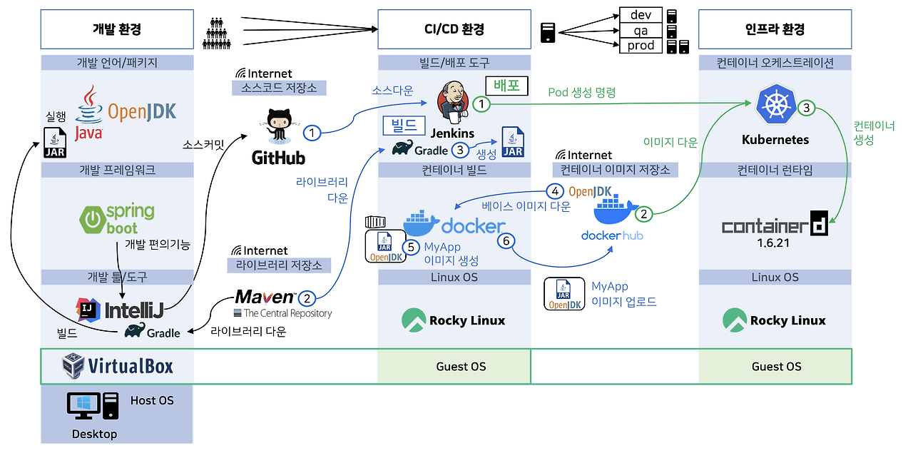 Jenkins가 Kubernetes에 pod(컨테이너 실행 단위)를 생성해달라고 요청하고, 그 요청에 이미지 주소를 첨부. - Kubernetes에서 이미지 다운로드