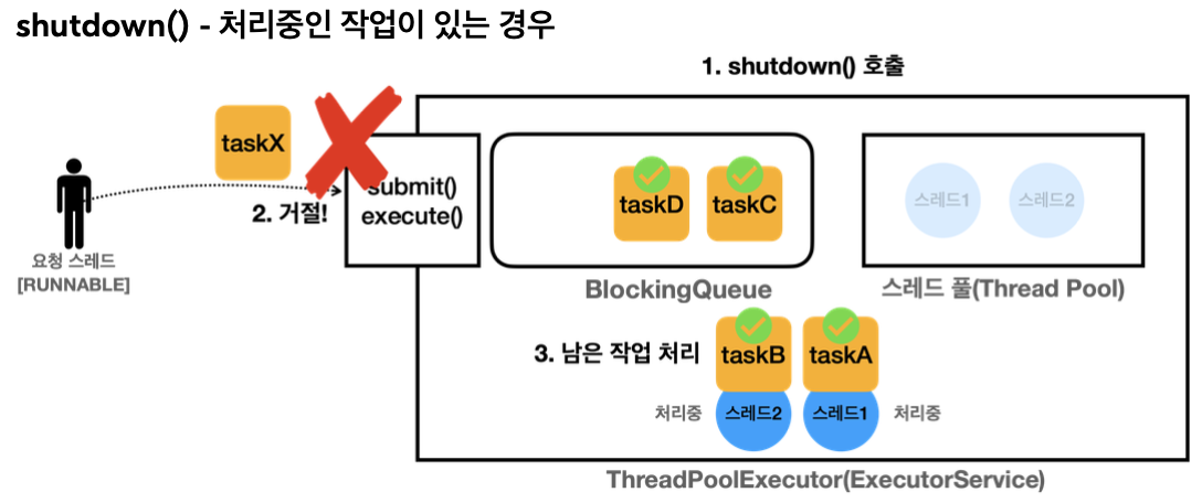 - 우선, shutdown()을 호출한다. 이제 새로운 주문은 받지 않겠다고 선언하는 것이다! 하지만, 이미 받은 주문은 계속 처리한다.