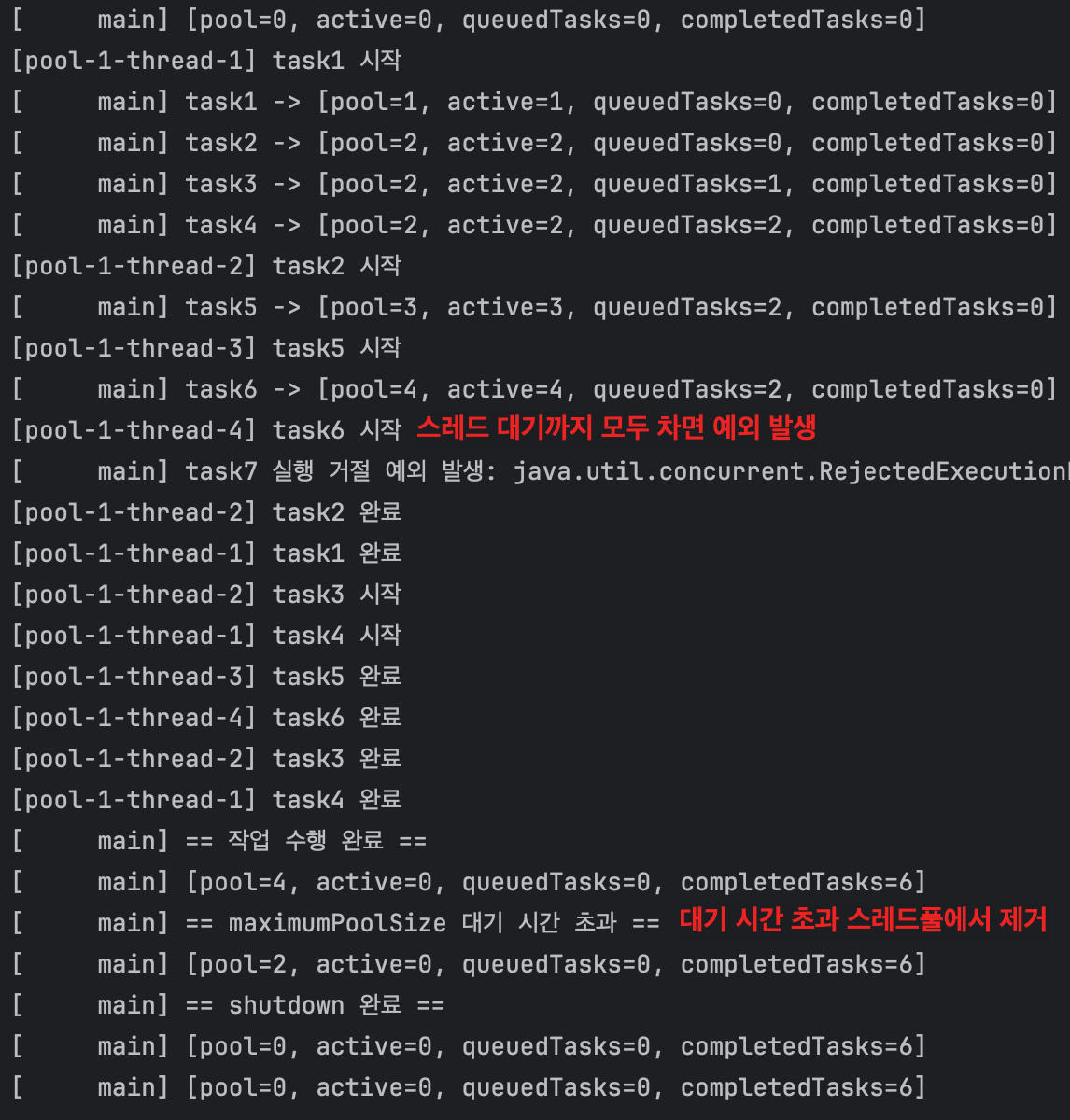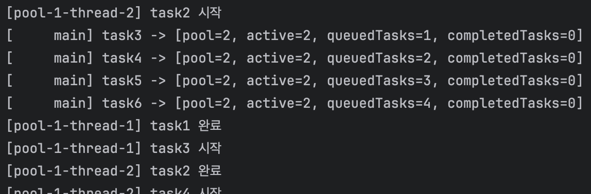 예외정책을 구현해보려면 위의 주석부분을 채우면된다. RejectedExecutionException 예외를 잡아서 작업을 포기하거나, 사용자에게 알리거나, 다시 시도하면 된다.